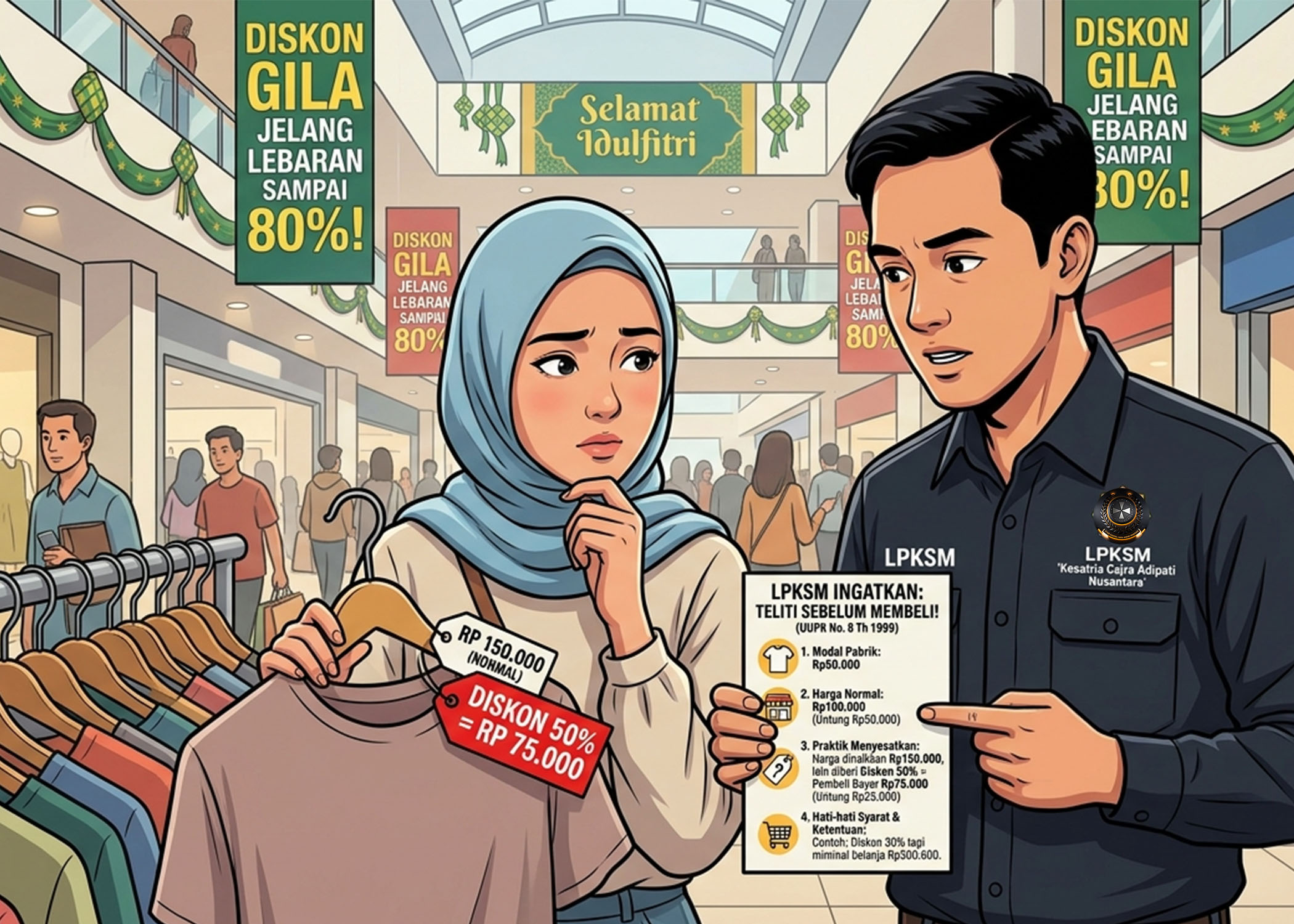 LPKSM ADIPATI ||| Menjelang Hari Raya Idulfitri, aktivitas belanja masyarakat biasanya meningkat, terutama untuk membeli pakaian baru dan berbagai kebutuhan lainnya. Di tengah maraknya promo dan potongan harga besar yang ditawarkan di berbagai pusat perbelanjaan maupun toko, masyarakat diimbau untuk tetap teliti dan bijak sebelum memutuskan membeli suatu barang.